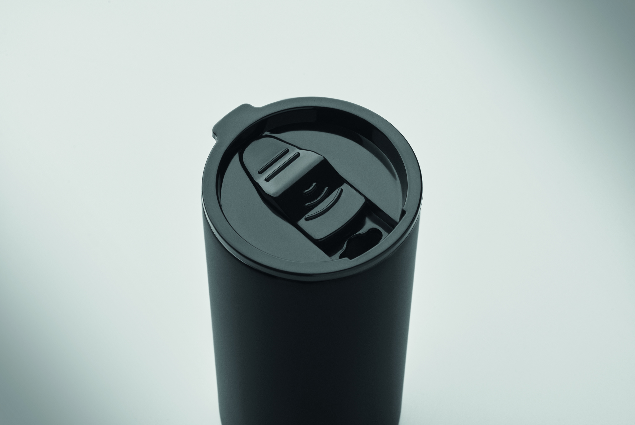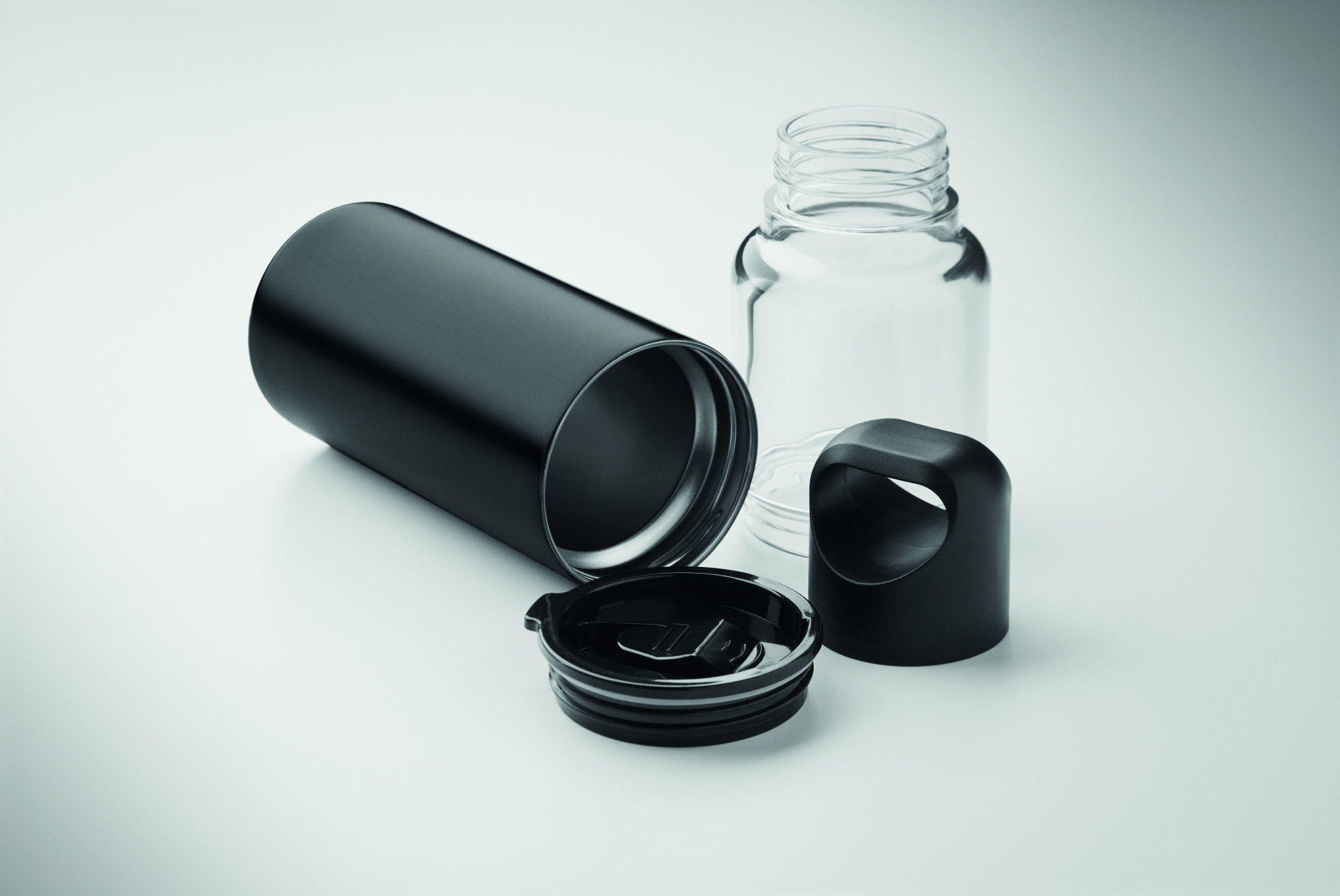 2in1 Flasche aus Tritan mit doppelwandigem Trinkbecher aus recyceltem Edelstahl (90 % recycelter Edelstahl und 10 % Edelstahl). 2 Deckel aus PP-Material. Füllmenge insgesamt: 610 ml, Becher 350 ml.
