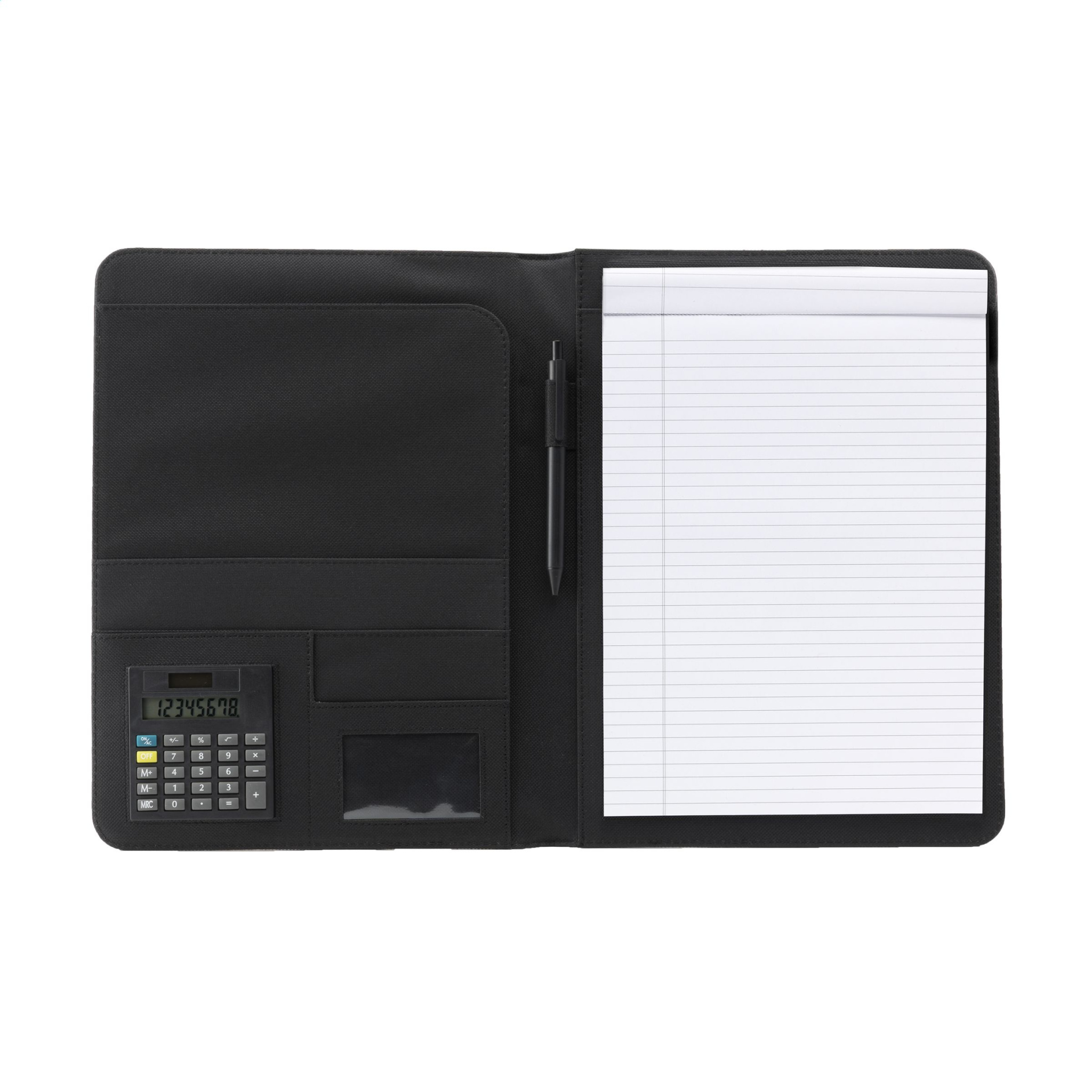 Konferenz-/Dokumentenmappe aus 600D Polyester/Kunstleder im A4-Format. Inkl. abnehmbarem Dual-Power-Taschenrechner (inkl. Batterie), Schreibblock und Kugelschreiber.