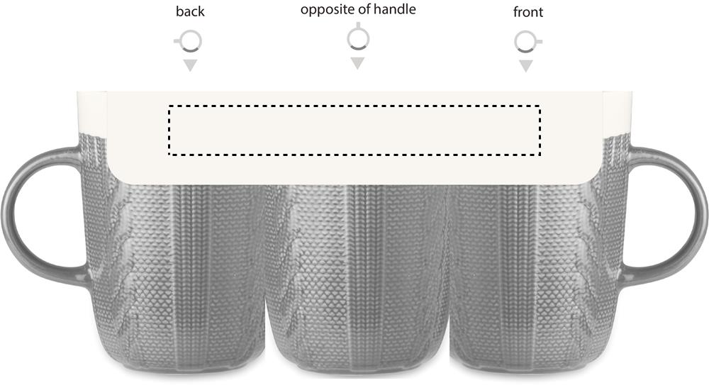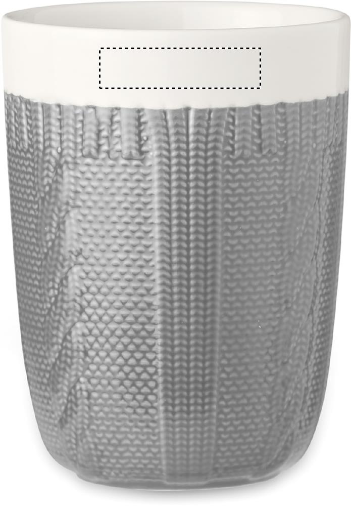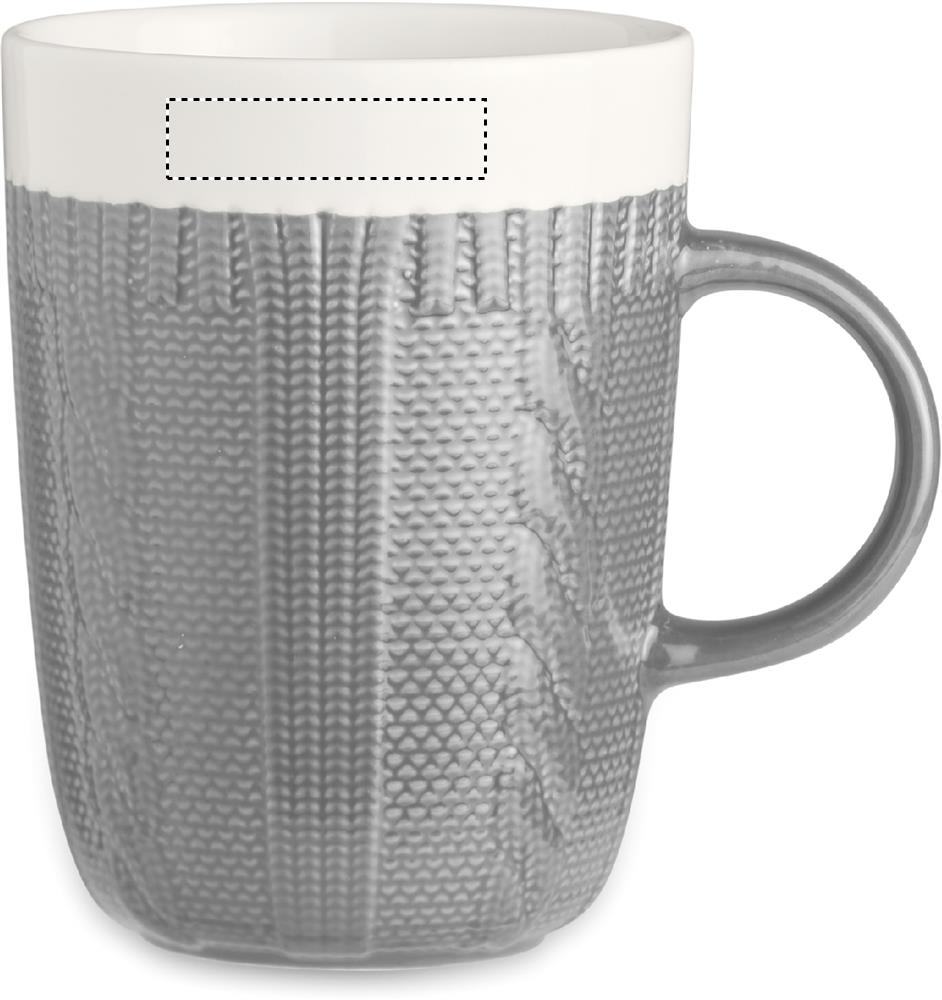 Kaffeebecher aus Keramik in Strick-Optik. Füllmenge: 310 ml. Nur Keramik-Transferdruck ist spülmaschinengeeignet. Verpackt in einem Karton.