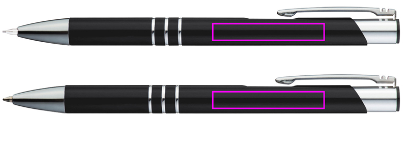 Schreibset aus Aluminium, bestehend aus einem Kugelschreiber mit blauschreibender Großraummine und einem Druckbleistift, jeweils mit Zierringen. Ihre Werbung wird rechts neben dem Clip eingraviert.