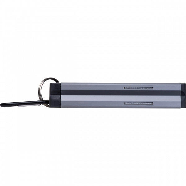 Mini-Wasserwaage aus Aluminium mit ABS-Kunststoff-Applikationen, zwei Libellen, einem Magneten an der Unterseite und einem Karabinerhaken. Ihr Logo wird mittels Lasergravur auf die Wasserwaage aufgebracht.