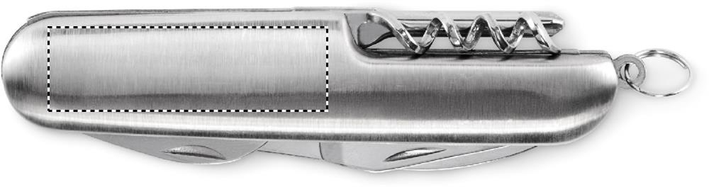 Multi-Tool-Taschenmesser aus recyceltem Aluminium. 5 Funktionen: Große Klinge, Kapselheber, Schraubendreher, Korkenzieher und Dosenöffner.