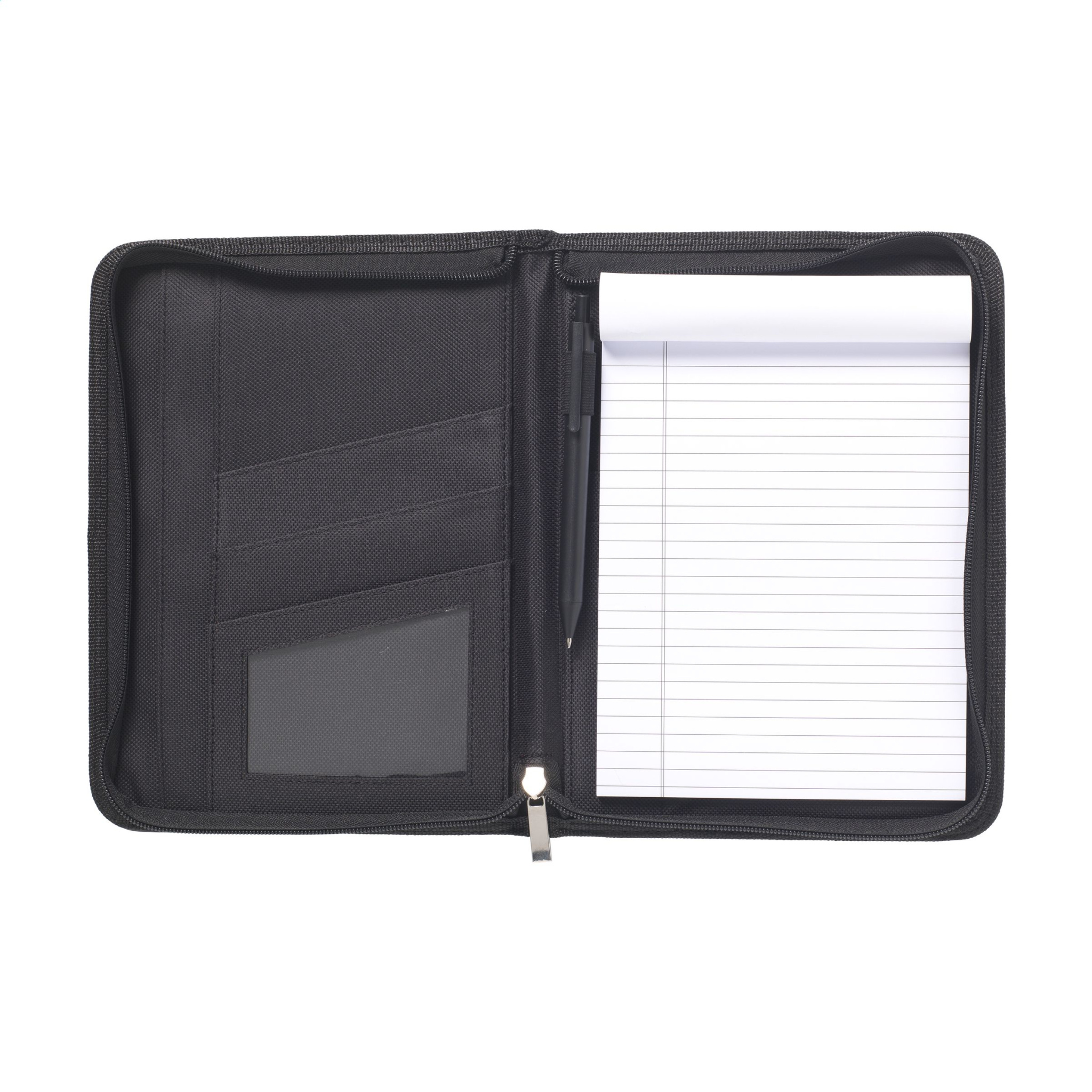 Konferenz-/Dokumentenmappe aus edlem Lederfaserstoff im Format A5. Mit vielen Einsteckfächern und Reißverschluss. Inkl. Schreibblock und Kugelschreiber. Jedes Stück einzeln verpackt.