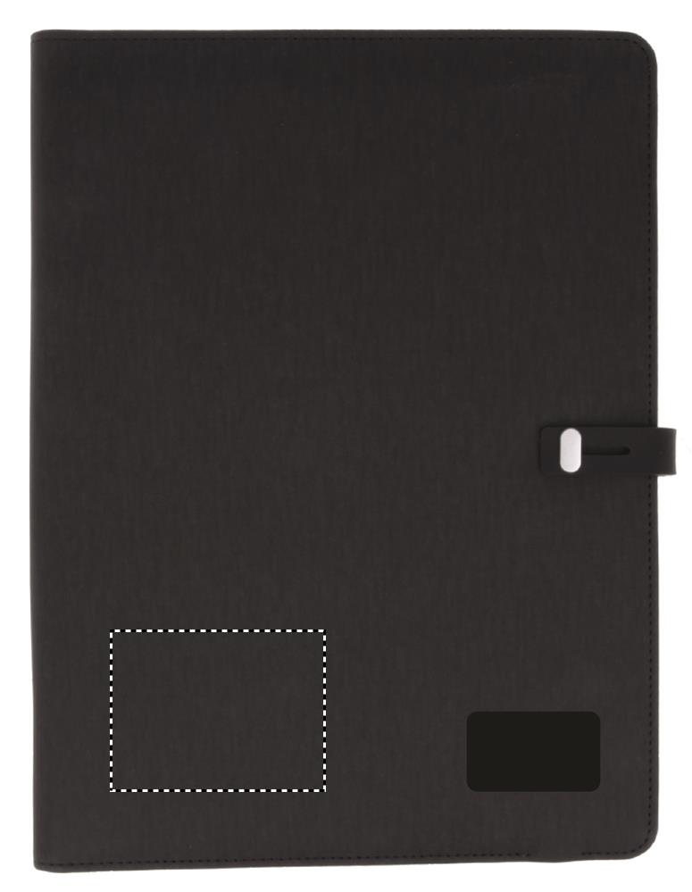 A4 conference folder portfolio in linen-PU with clasp closure. DC5V/1A wireless charging. 4000 mAh power bank with a micro USB to a type C connector. 20 lined sheets notpad. Card holder. Pen holder. Black aluminium plate ideal for your logo.