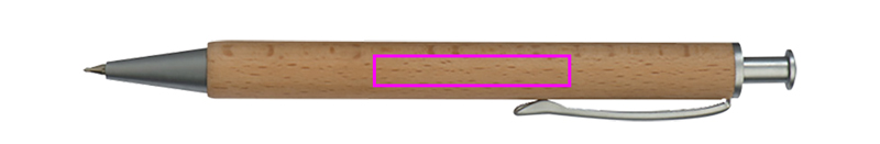 Wooden ballpen with blue-writing metal system refill and a wooden case. The laser engraving is mounted below the clip.