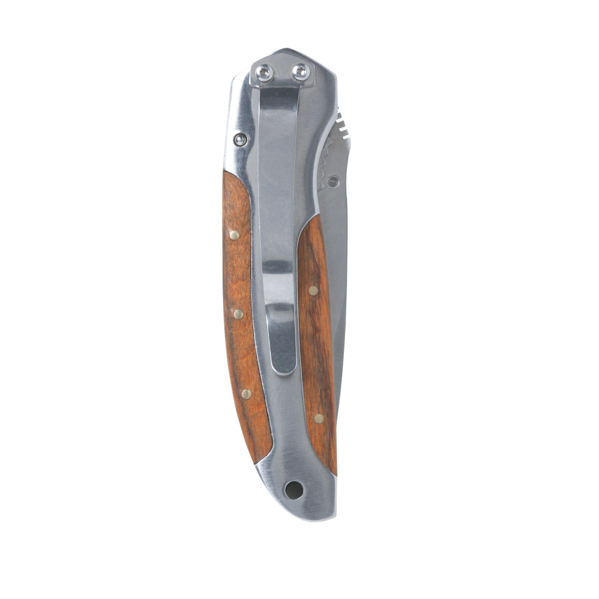Robust stainless steel survival knife with serrated edge blade, wooden inlay in the handle and handy clip. Please note local rules may apply regarding the possession and/or carrying of knives or multitools in public.. Each item is supplied in an individual brown cardboard box.