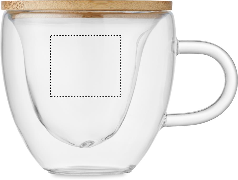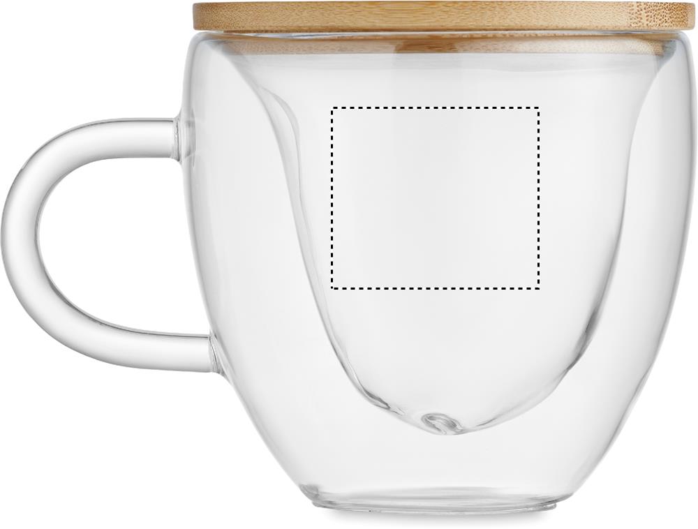 Double wall borosilicate glass mug with heart shape and bamboo lid. Capacity: 180 ml. Bamboo is a natural product, there may be slight variations in colour and size per item, which can affect the final decoration outcome.