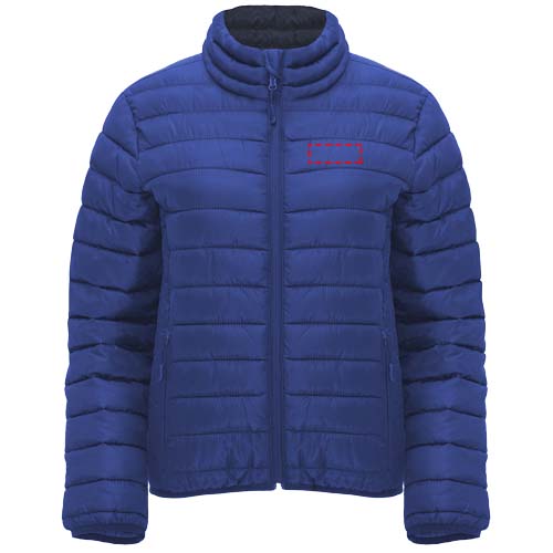 Women's quilted jacket with feather touch padding. Inverted zippers with matching chin protector and puller. Two front pockets with zippers. Matching elastic edging in collar, cuffs and hem. Contrasting inner lining. Includes stow carry bag. Lightweight and foldable garment. Fitted cut. Removable label. Water resistant. Wind-proof. The model is 179 cm and is wearing size S.