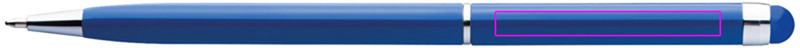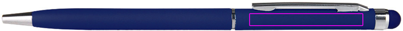 Stainless steel ballpen with blue-writing plastic refill and color-matched touch function above the clip. We will engrave your logo below the clip.