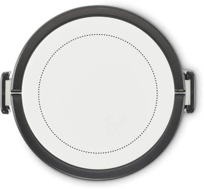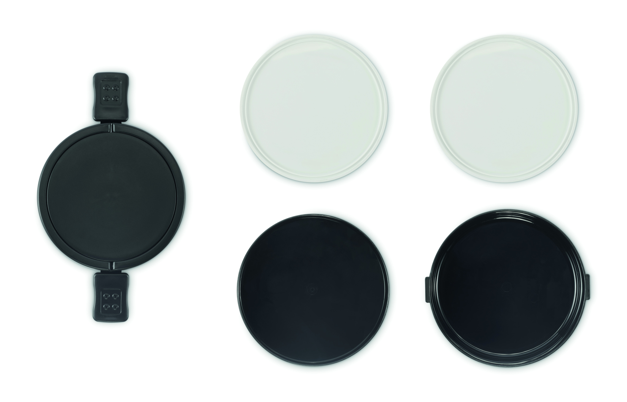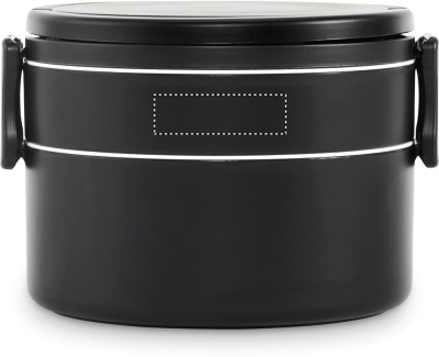 Two-tier round lunch box made of PP with side clip closure and handles. Includes inner lids in white. Capacity 250 ml top, 700 ml bottom.