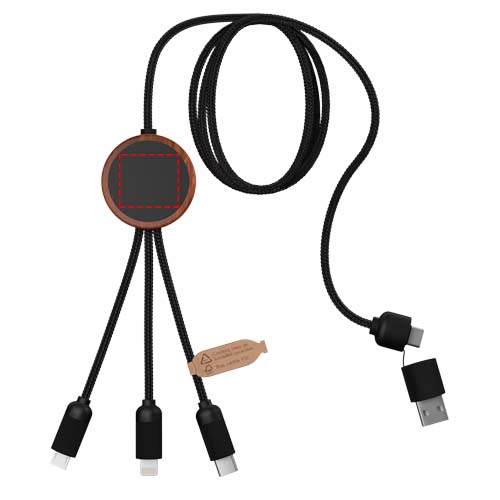 5-in-1 recycled PET light-up logo charging cable with round bamboo casing. The light-up logo is visible on both sides. Features 3 connectors (type C, micro USB, iPhone) and a dual USB connector for universal use. Delivered in a TPU pouch with a kraft paper card. Cable length: 1 metre. Includes 3 year warranty.