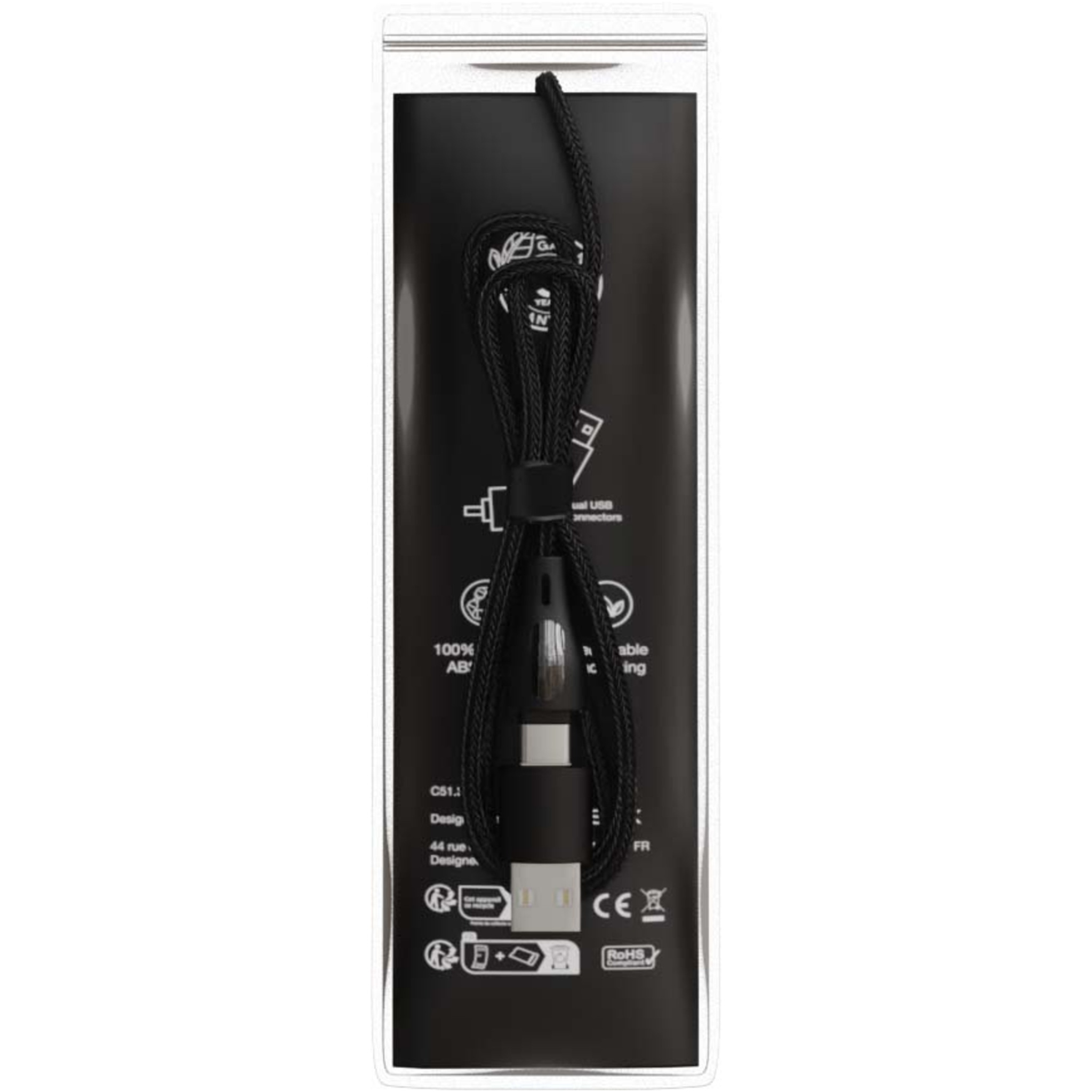 5-in-1 60W recycled PET fast charging cable with illuminated double-sided logo, and it features 3 connectors (Type-C, iPhone and Android). The dual USB-A + USB-C input, makes the cable 100% compatible with the latest computer models. The cable can charge several devices simultaneously. Delivered with a recyclable TPU pouch and a recycled paper insert. Cable length: 1 metre.