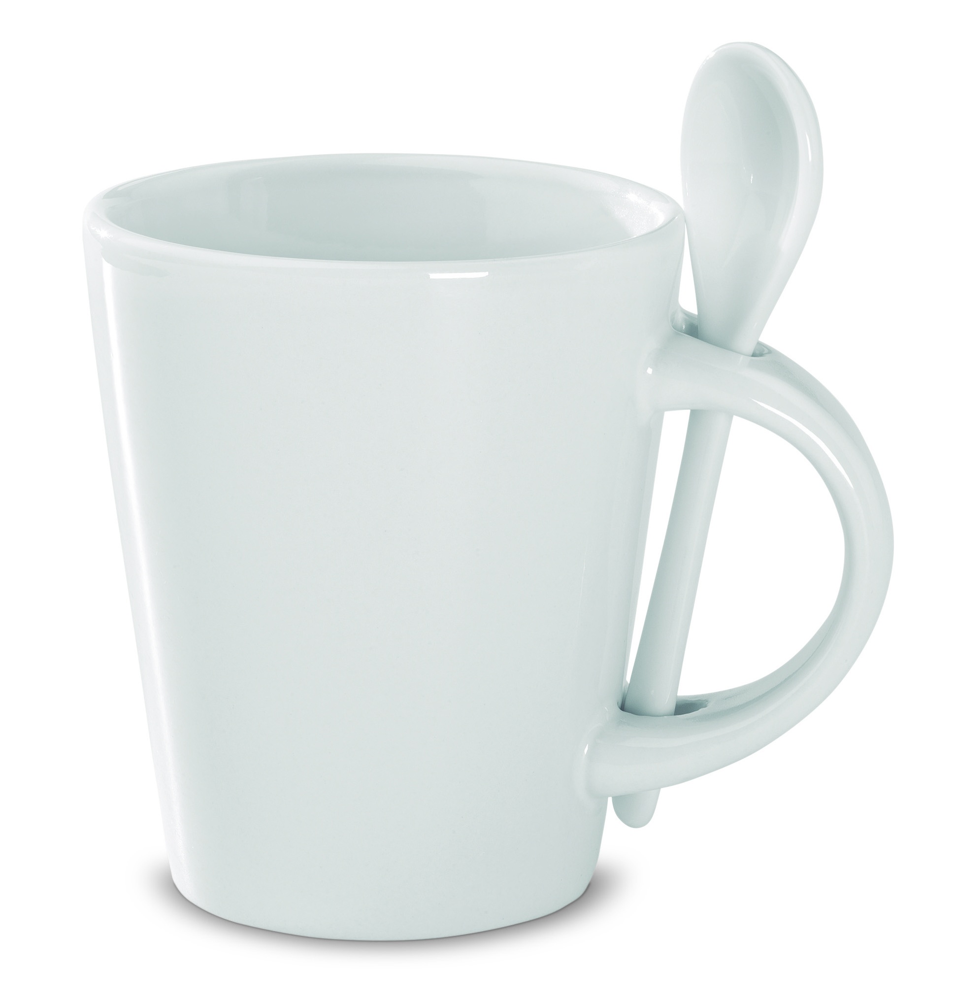 Stoneware mug of 300 ml capacity with special coating for sublimation printing. It has a spoon on handle. Individual packing in white carton box.