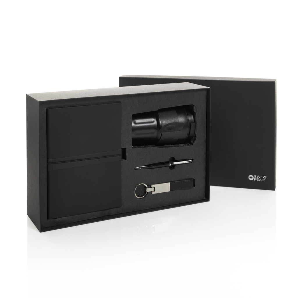 This luxury gift set includes all the essentials you need to get through your workday in style. The 350 ml double-walled tumbler is vacuum insulated, keeping your drink hot or cold for an extended period. The leak-proof lid ensures your clothes stay dry, even if the tumbler is accidentally tilted or not held upright.To keep your most important keys always within reach, the set includes a premium Swiss Peak keychain featuring a glossy metallic finish and a beautifully crafted PU leather strap.Need to jot down some thoughts or ideas? This set also comes with a sleek business ballpoint pen with a writing capacity of 1000 meters, and a soft-touch PU notebook made from recycled polyester. The notebook contains 160 cream-colored pages made from recycled paper.All items in this gift set are RCS certified, guaranteeing a fully verified supply chain for the recycled materials used. In total, the products in this set consist of 75% recycled content.