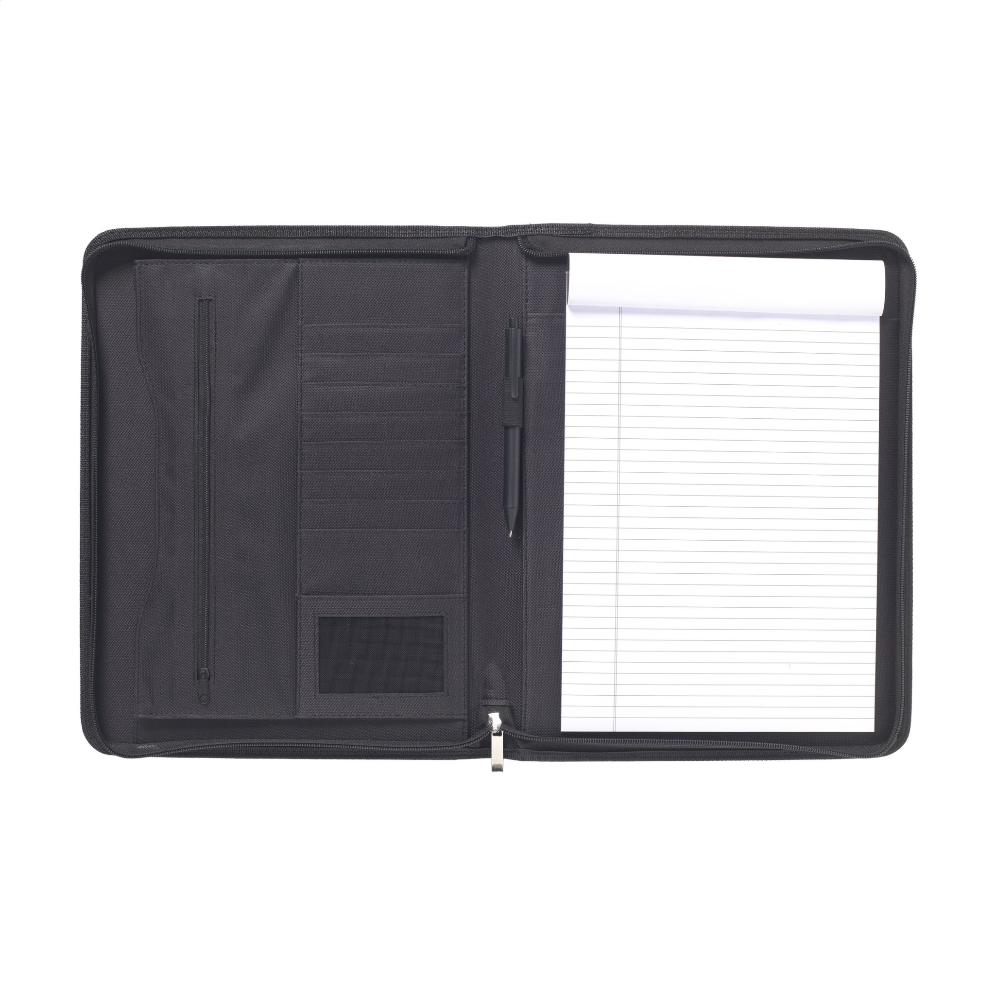 Conference/document folder made from fine, bonded leather in A4 format. With several pockets, business card slots and zip closure. Incl. writing pad and ballpoint pen. Each item is individually boxed.