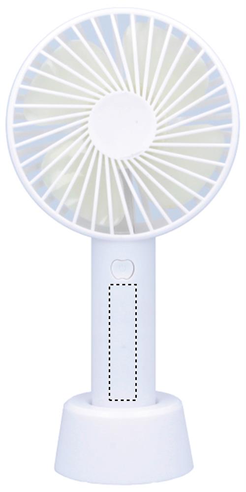 Small portable fan with additional stand to use as desk fan. 3 speed settings. USB port rechargeable battery 2000 mAh.