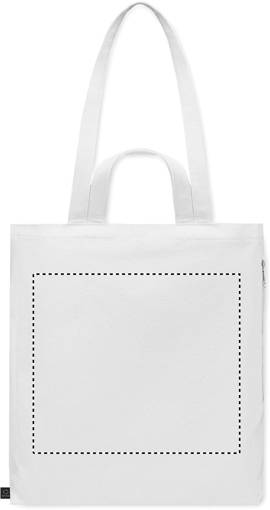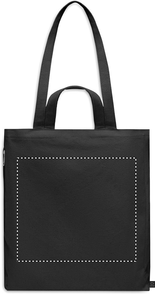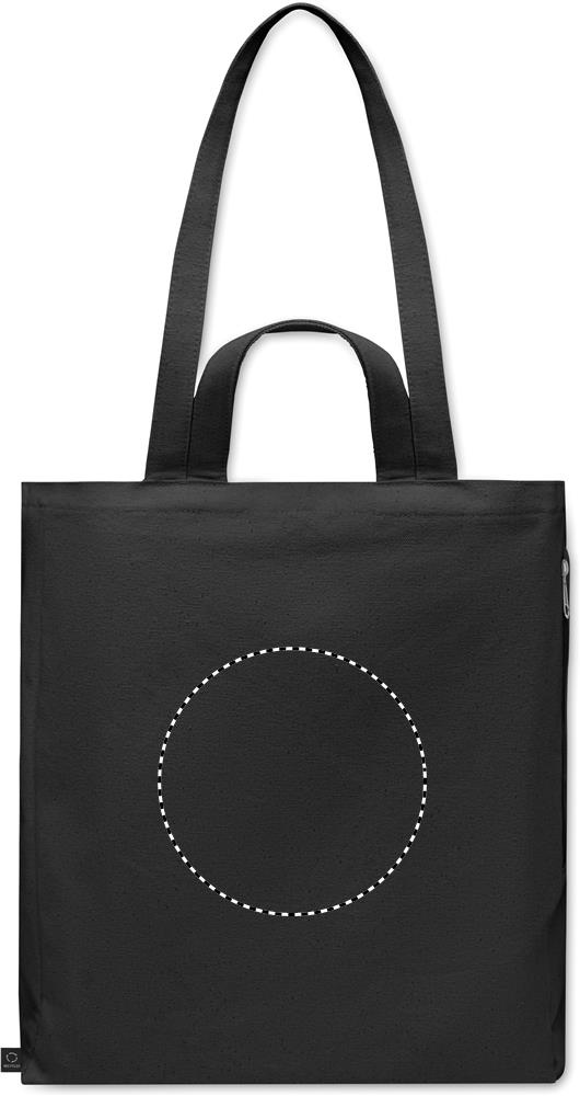 Must taaskasutatud polüpuuvillasest ostu- või rannakott (70% taaskasutatud puuvill, 30% taaskasutatud polüester) lühikeste ja pikkade sangadega. Sellel on külgmine lukuga tasku. 380 gr/m².