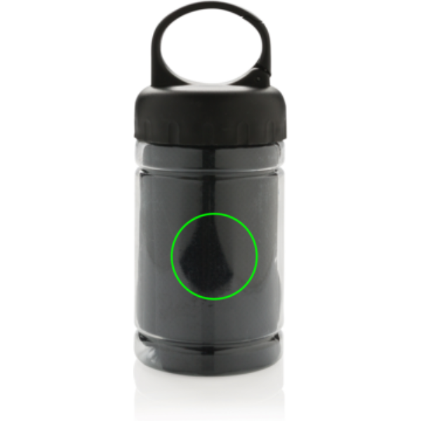 Mikrokiust jahutusrätik 100% kemikaalidevaba. 98% päikesekaitse funktsioon kuni UV 50+ kaitseni. Rätikut saab hõlpsasti kasutada, lisades pudelisse veidi külma vett, luues jaheda rätiku kiireks värskendamiseks. Pudel on valmistatud PP-st, millel on ABS pealispind ja karabiin, mida saab õuetegevustes kaasa võtta. 77x30 cm.