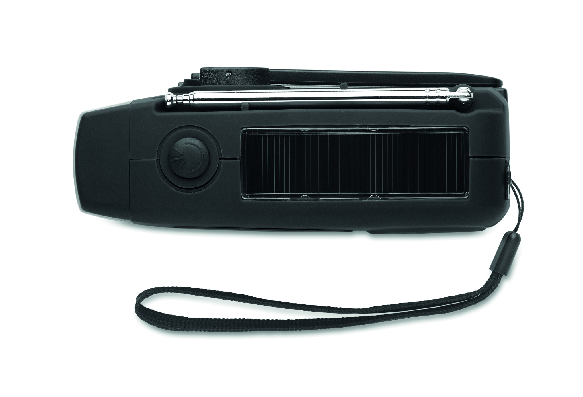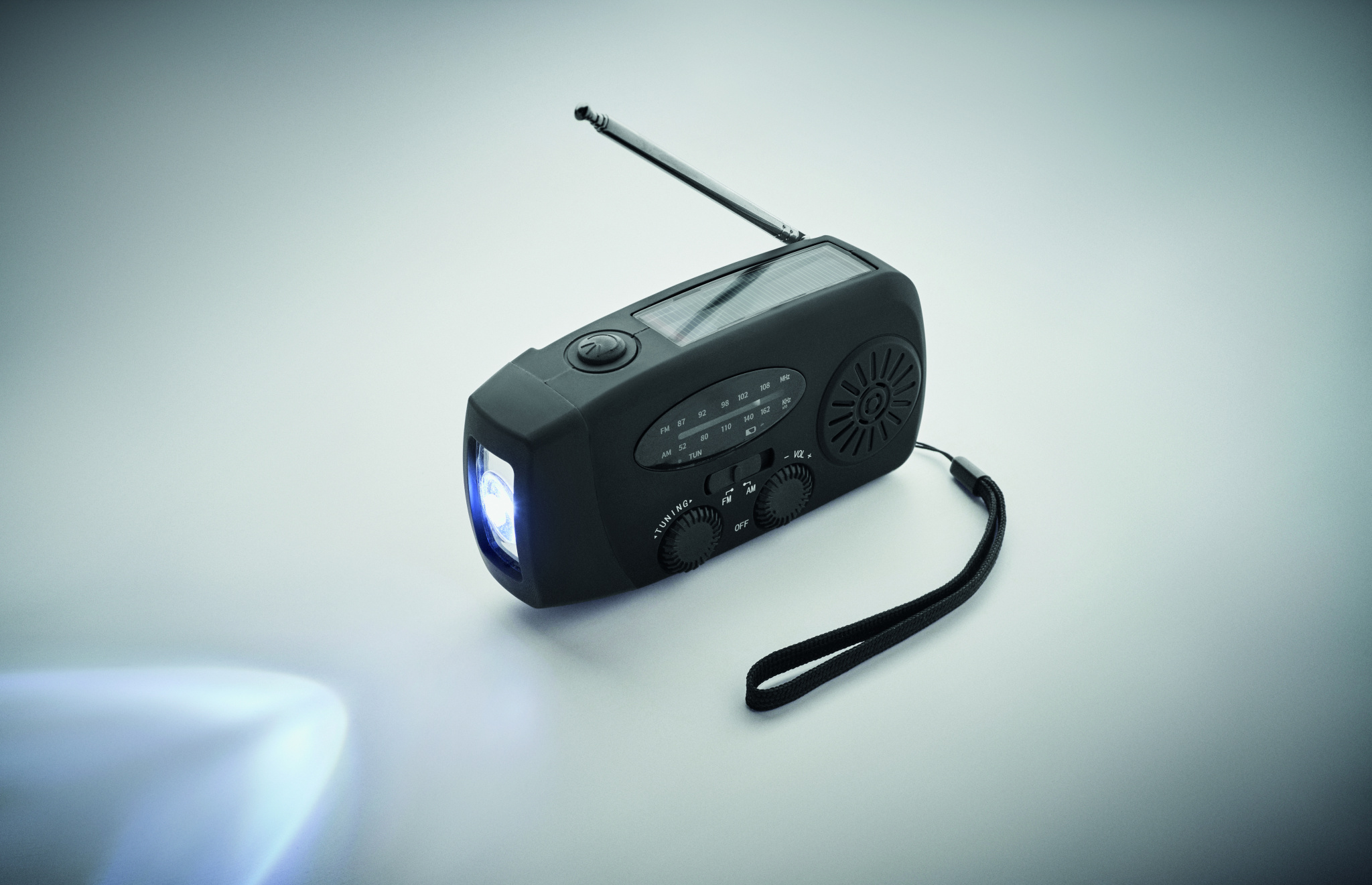 Kaasaskantav AM/FM-raadio ABS-plastist, LED-taskulamp (2 seadistust) ja 1200 mAh akupank hädaolukorras laadimiseks. Töötab päikesepatareide ja käsivända abil.