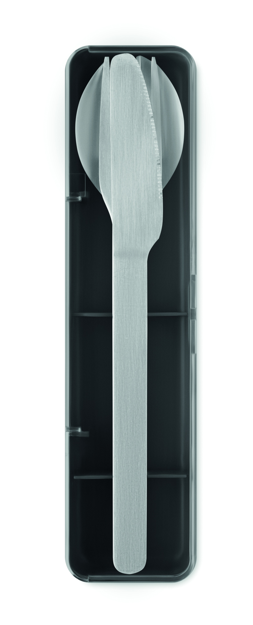 Roostevabast terasest söögiriistade komplekt PP-ümbrisega. Komplekt sisaldab kahvlit, nuga ja lusikat.