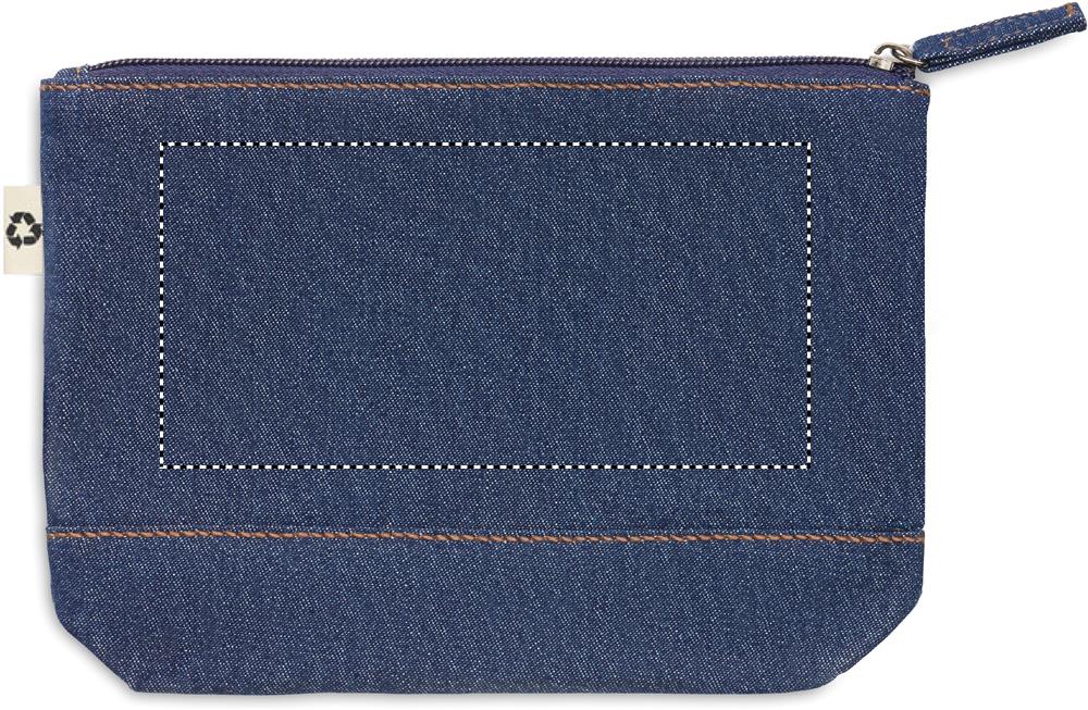 50% taaskasutatud puuvillast värviga teksariidest ja 50% puuvillast lukuga kosmeetikakott. 250 gr/m².