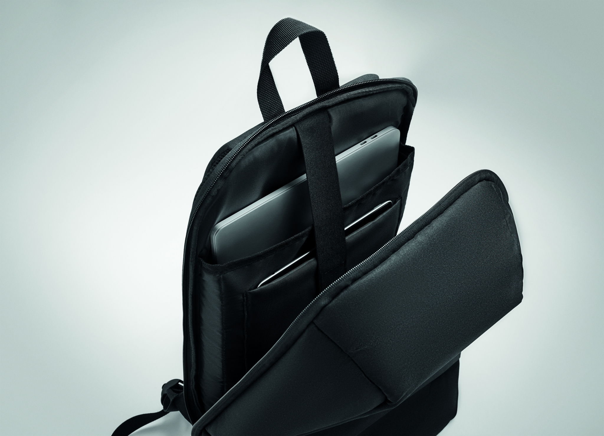 15 tuuman varkaudenestoinen läppärireppu 600D RPET -polyesteriä. Useita lokeroita, joista yksi on pehmustettu tabletille ja muille tavaroille. Pehmustetut olkahihnat ja päälokero takana.