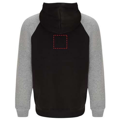 Kaksivärinen unisex-huppari. Hupussa ristikkäinen pääntie ja metallilenkit. Kontrastivärinen hupun sisäosa, kiristysnyöri ja raglan-hihat. Kengurutasku. Hihansuut ja helma 1x1-elastaanijoustinneuletta. Irrotettava etiketti.