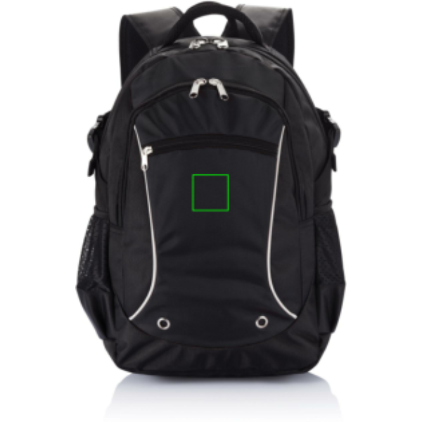 1680D jakardikuvioinen selkäreppu. Vetoketjullinen etutasku pitää tavarat järjestyksessä. Vetoketjullinen päätasku, pehmustettu, 15,6” kannettavalle tietokoneelle. Heijastavat reunoitukset. Kaksi verkkotasku sivuilla. Ei sisällä PVC:tä.