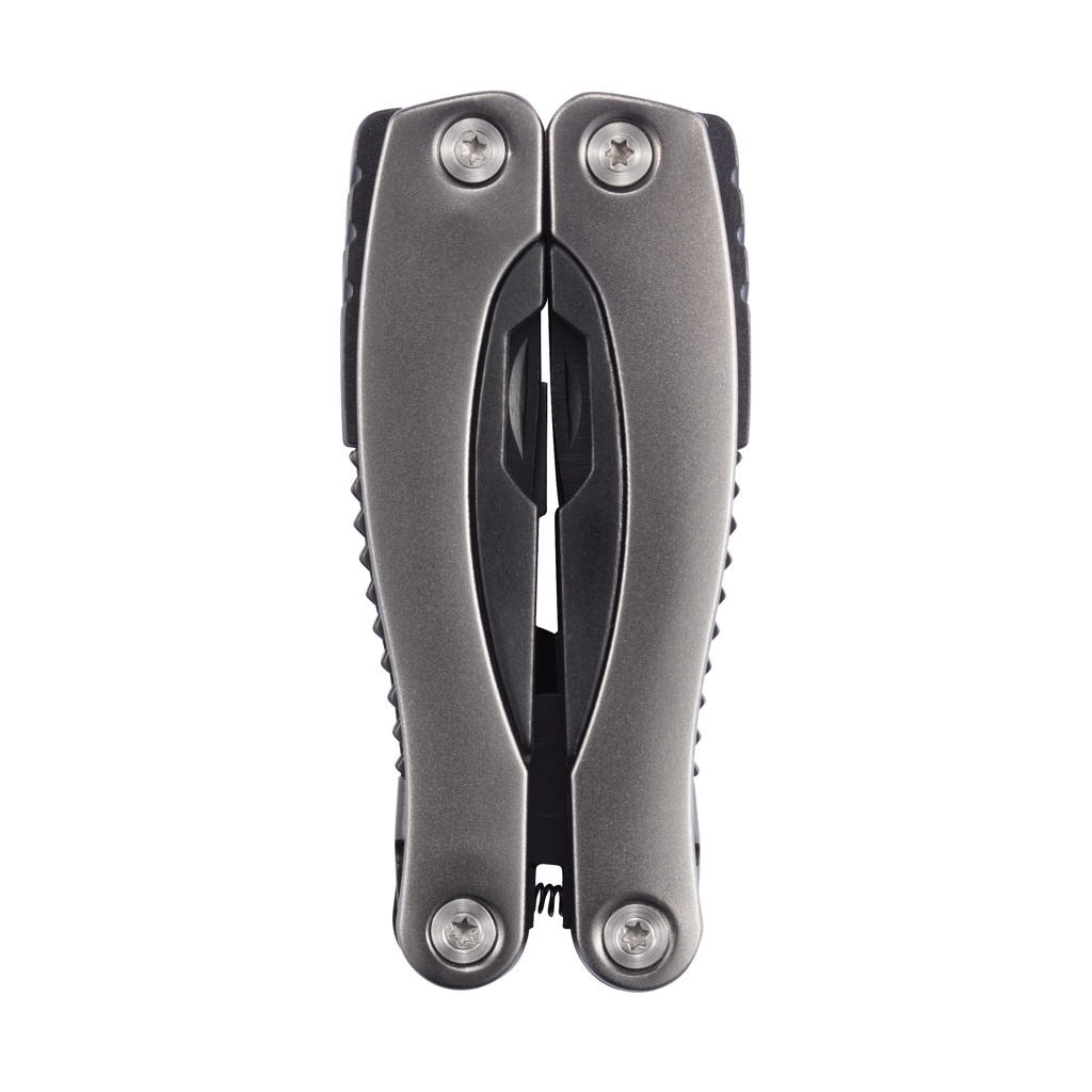 14 toimintoa, musta monitoimityökalu ruostumattomasta teräksestä, anodisoitu alumiinikahva. Sisältää mustan säilytyspussin.