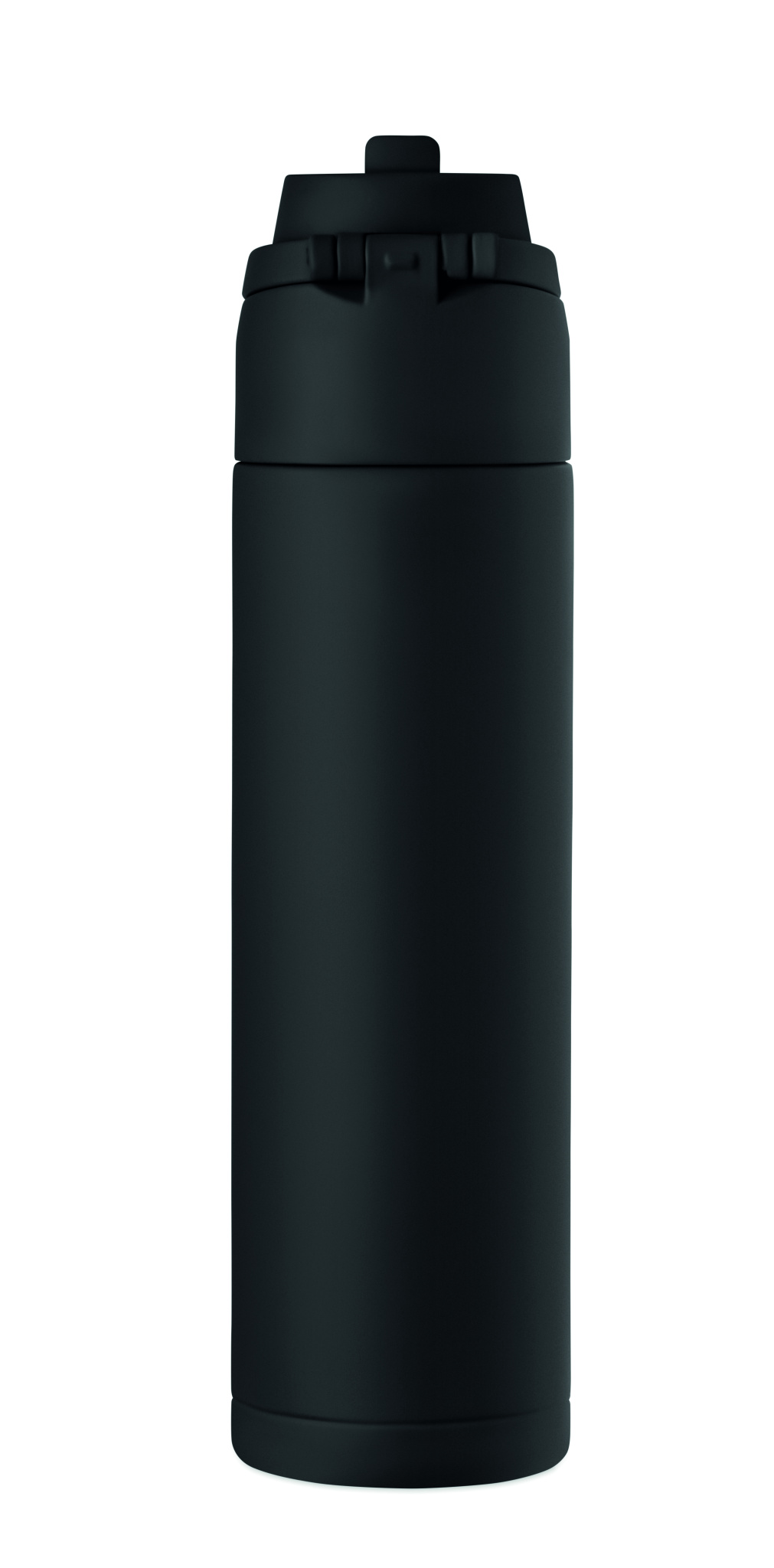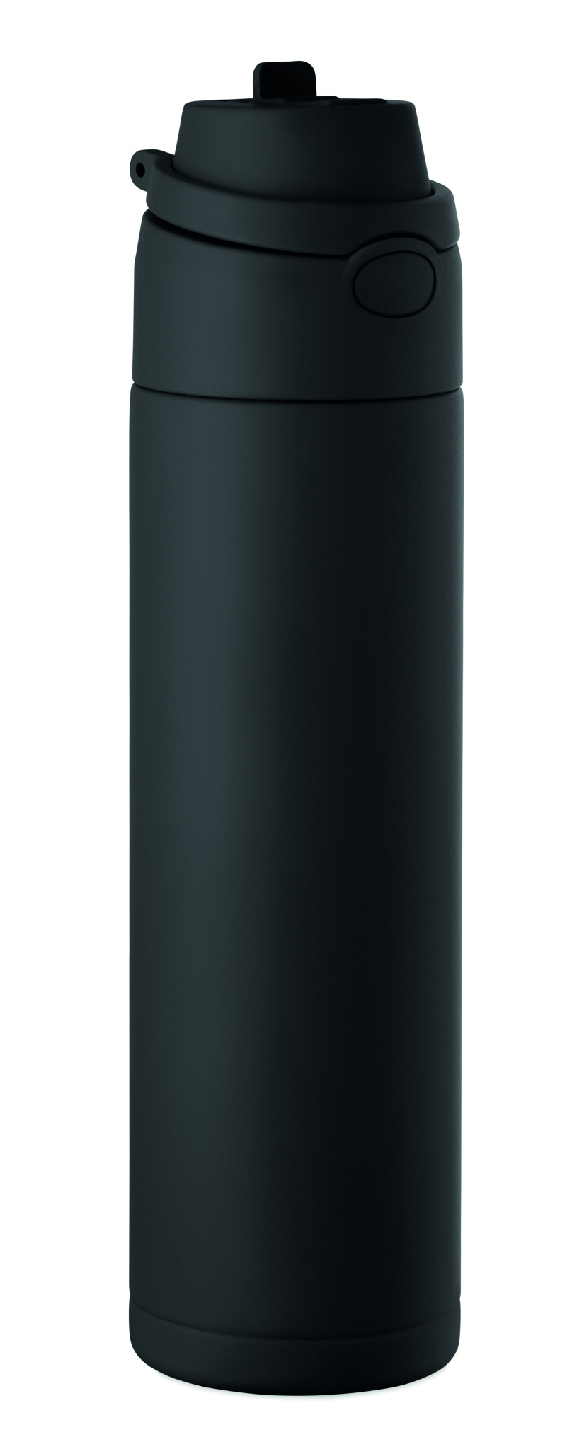 Kaksiseinäinen eristetty juomapullo, 90 % kierrätettyä ja 10 % ruostumatonta terästä. 2‑in‑1 juoma- ja pillikansi PP:tä, kahva, vuotamaton. Tilavuus 500 ml.