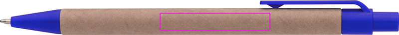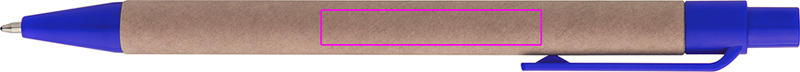 Kierrätyspaperista ja värillisistä muovisovelluksista valmistettu kuulakärkikynä, sininen kirjoitus. Logosi on painettu leikkeen oikealle puolelle.