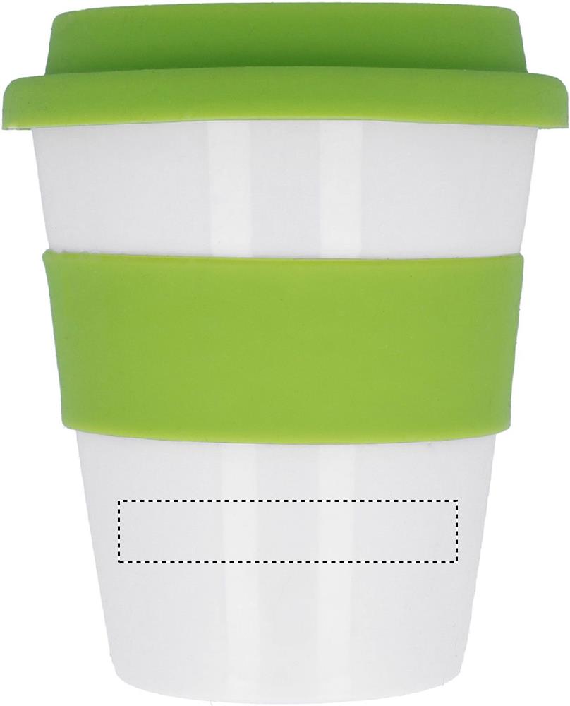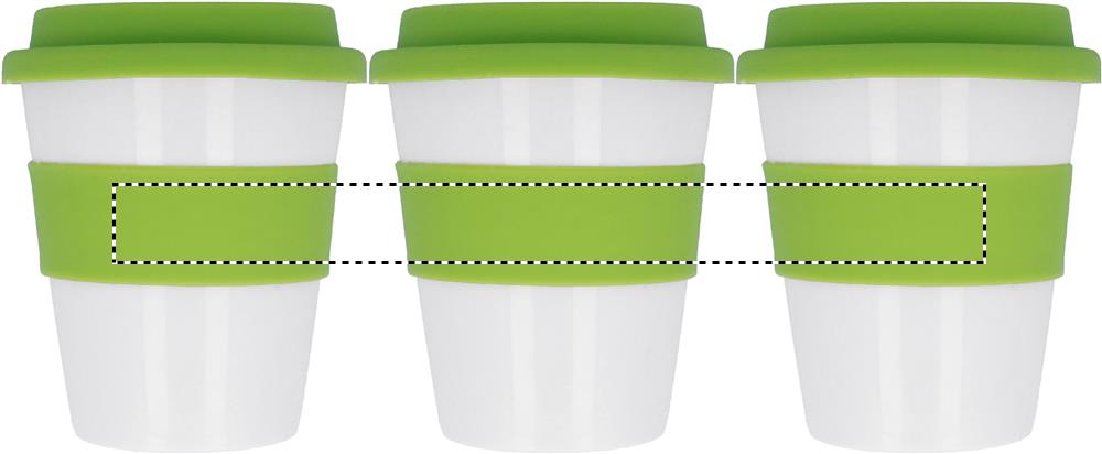 Yksiseinäinen 350 ml PP muki silikonikannella ja -vyötteellä, tuote saattaa kuumentua ulkoisesti käytössä.