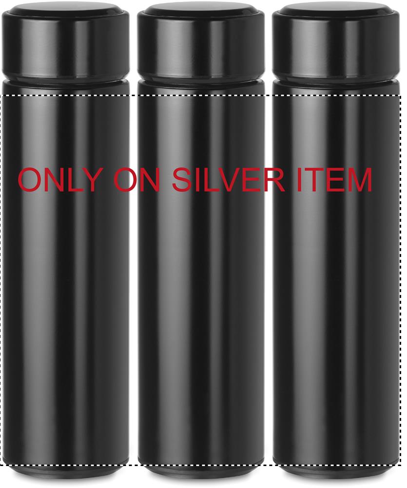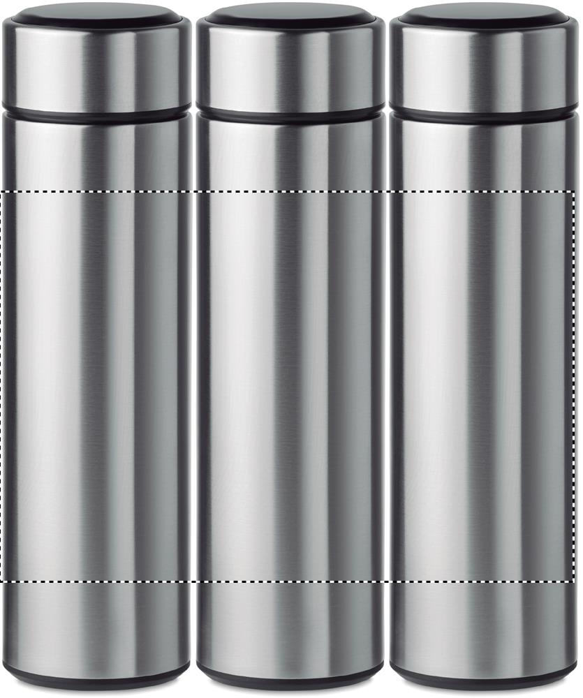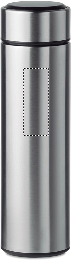 Kaksiseinäinen ruostumattomasta teräksestä valmistettu 450 ml termospullo, sisältää LED kosketusnäytön pullon korkissa ja teesiivilän, tuote on vuoto vapaa. 1 CR2032 patteri sisältyy toimitukseen.