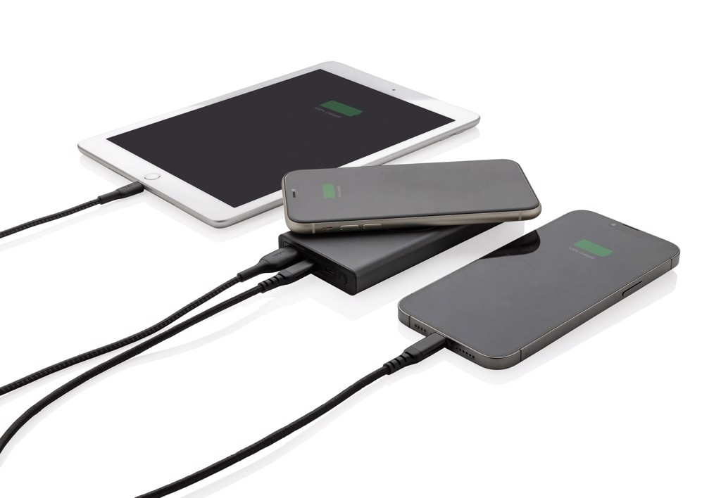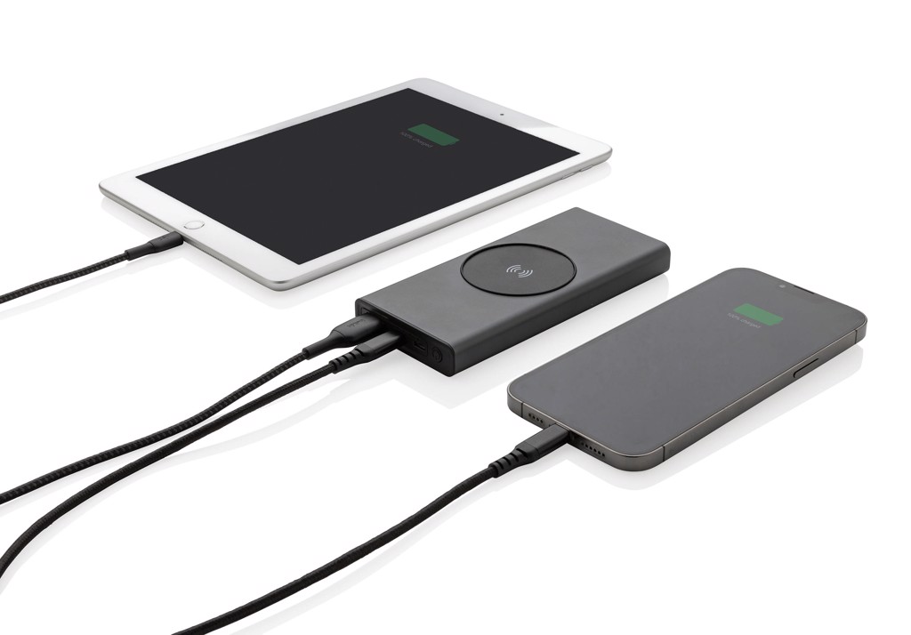 Ultranopea varavirtalähde, joka on valmistettu RCS (Recycled Claim Standard) -sertifioidusta kierrätetystä alumiinista ja ABS:stä. Kierrätetyn materiaalin kokonaismäärä: 28% tuotteen kokonaispainosta. Alumiini ei menetä ominaisuuksiaan kierrätysprosessissa, ja sitä voidaan kierrättää loputtomasti. Sisältää pitkäkestoisen A-luokan 10000 mAh litiumpolymeeriakun. C-lähtöportti tukee jopa 18W nopeaa latausta ja nopeaa uudelleenlatausta 3 tunnissa. Langaton laturi tukee latausta 10W asti. Virran merkkivalot kertovat, milloin on aika ladata tuote uudelleen. Tuote ja lisätarvikkeet 100% PVC-vapaita. Sisältää tyypin C latauskaapelin valmistettuna RCS-sertifioidusta kierrätetystä alumiinista, TPE:stä ja PET-materiaalista. Pakattu FSC® sekoituksesta valmistettuun pakkaukseen. USB lähtövirta 5/3A, 9V/2A. 12V/1.5A. Tyypin C lähtövirta: 5V/3A, 9V/2A, 12V/1.5A. Tyypin C tulovirta: 5V/3A, 9V/2A, 12V/1.5A. Mikro USB tulovirta: 5V/2A, 9V/2A, 12V/1.5A.