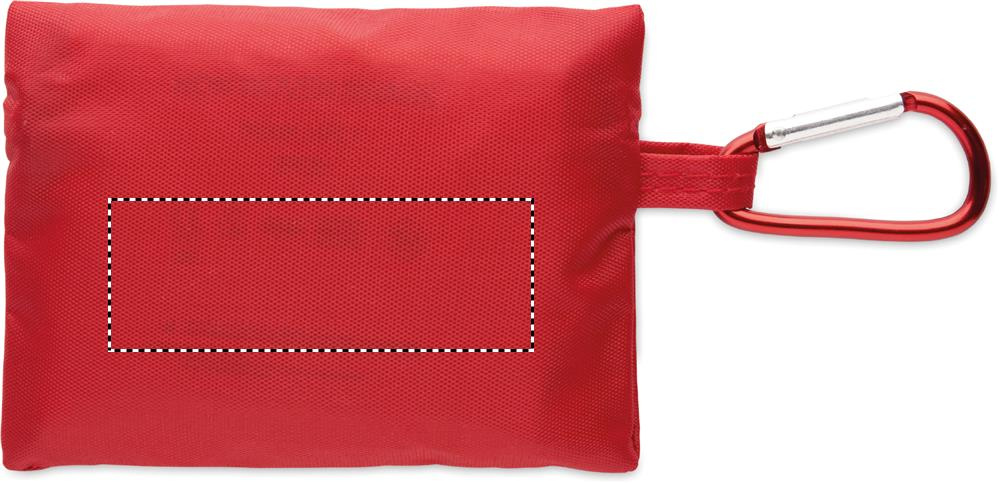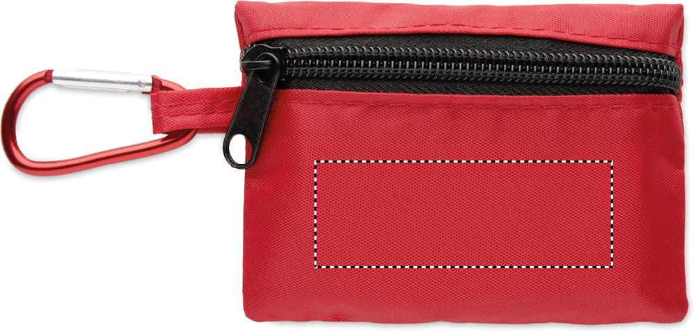 Kompakta pirmās palīdzības aptieciņa RPET maciņā ar alumīnija karabīni. Komplektā ietilpst 4 spirta tamponi, 3 plāksteri, 2 pārsēji, 2 marles spilventiņi, 1 līmlente un 1 šķēres. Nav pieejams pārdošanai ārpus ES.