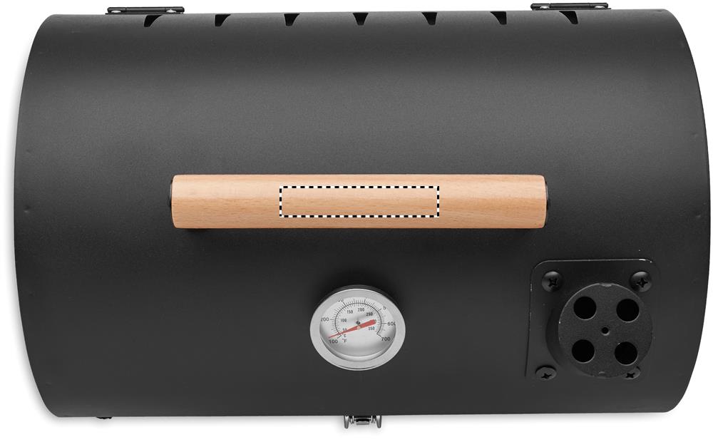 Переносной железный барбекю-мангал с дымоходом и термометром. Черный цвет. Фиксатор и деревянная ручка для переноски.