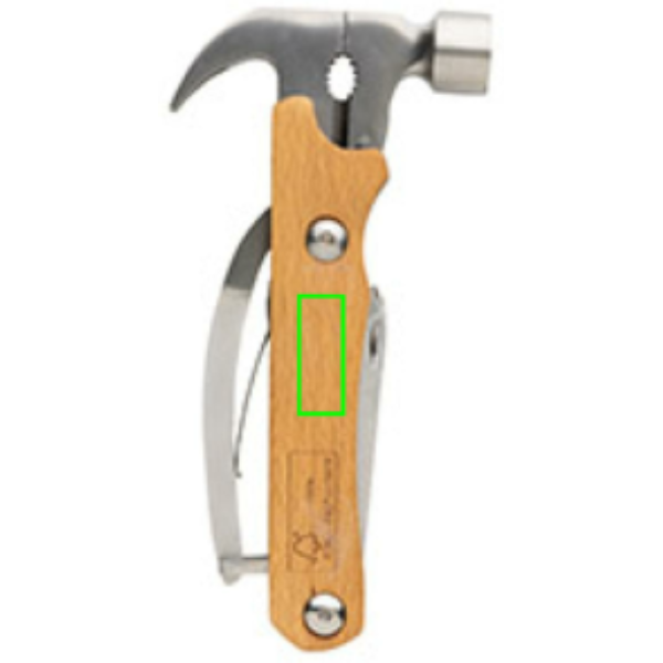 Многофункциональный инструмент Hammer, изготовленный из 100% древесины бука FSC, нержавеющей стали высокой твердости и коррозионностойкой стали (420). Твердость по Роквеллу 42-52. Изделие имеет 10 функций: плоскогубцы, гвоздодер, коготь, молоток, кусачки, напильник, плоская отвертка, открывалка для бутылок, крестовая отвертка, пила, нож. Лезвие безопасно для пищевых продуктов. Упаковано в коробку FSC mix kraft.