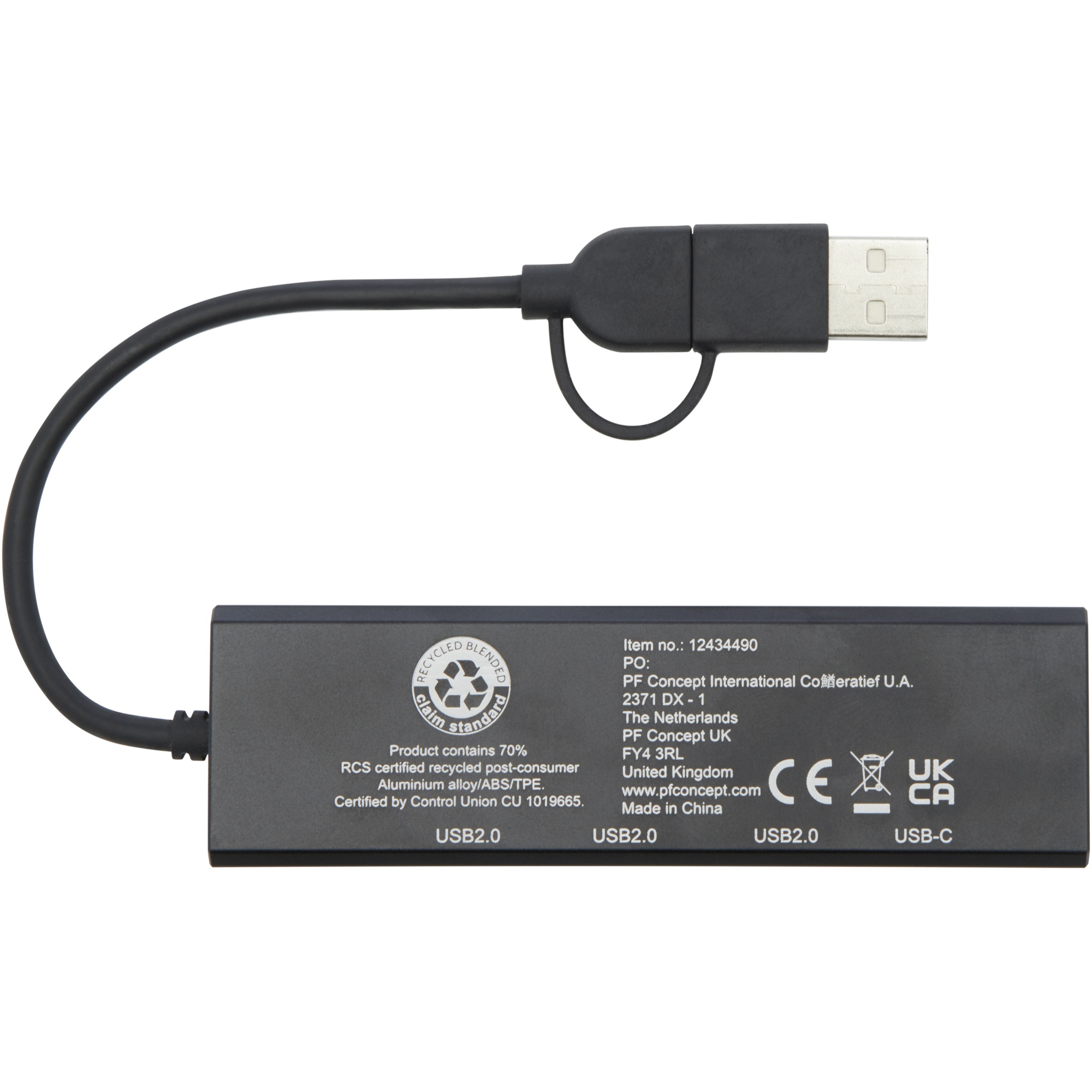 Концентратор USB 2.0 Rise из переработанного алюминия, сертифицированного по стандарту RCS