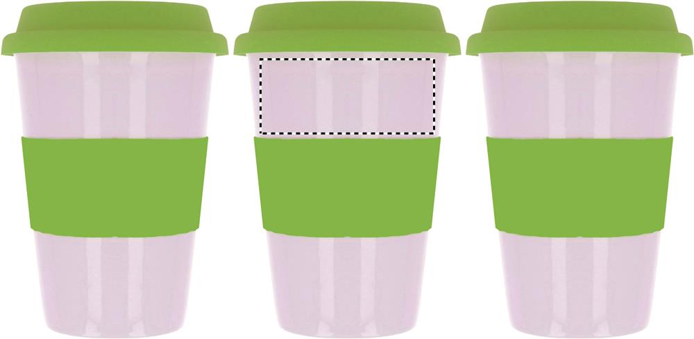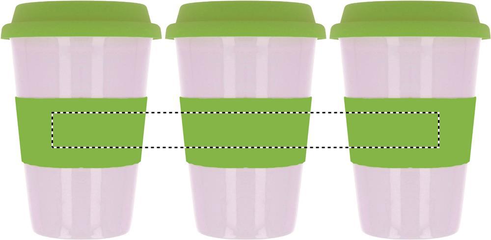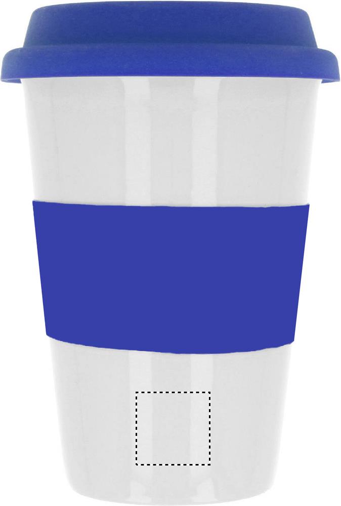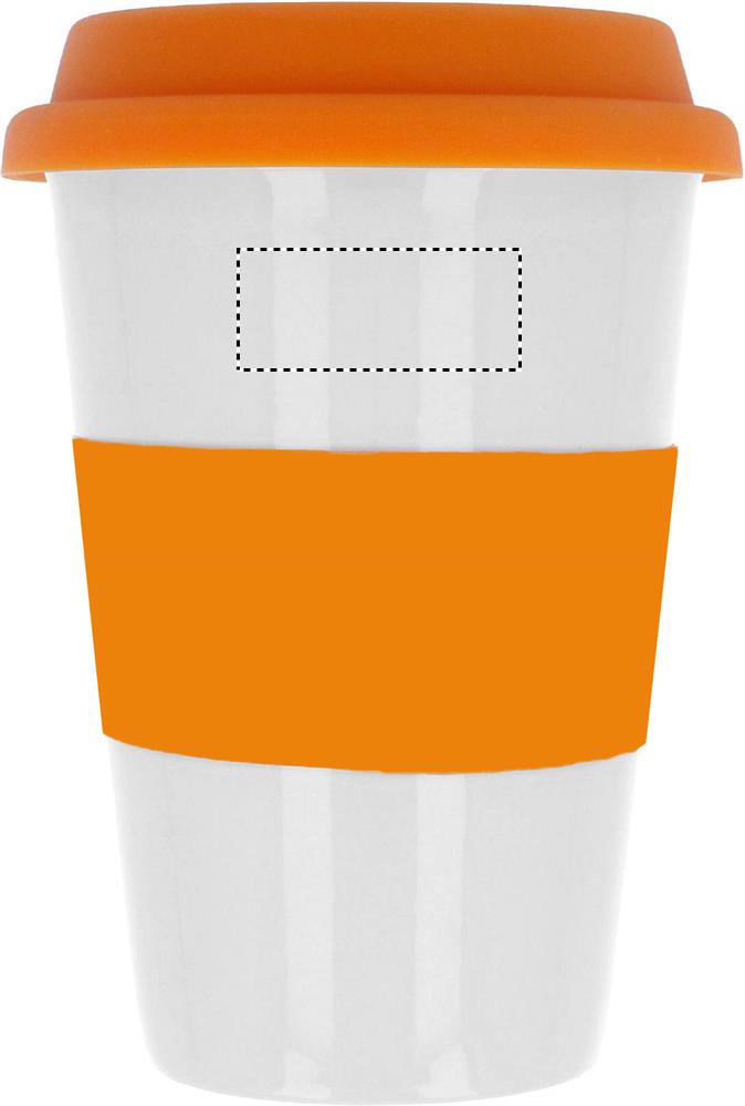 Одностенчатая керамическая кружка с силиконовой крышкой и ободком. Емкость 400мл . Керамотрансфер подойдет для мытья в посудомоечной машине. Поскольку это одностенчатая кружка , осторожно - может нагреваться!