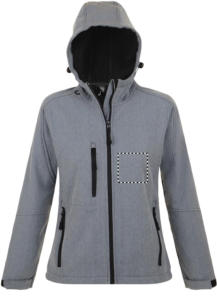 SOL'S REPLAY women softshell jacket 340g. Карманы на молнии по бокам и на груди, стягивающий шнур на талии регулируемые с помощью липучек манжеты капюшон со стягивающим шнуром. Fabric details: 94% полиэстер - 6% эластан. Флисовая подкладка: 100% полиэстер. 3 слоя. Водонепроницаемое покрытие: 8000 мм дышащее. OEKO-TEX. Only Sold with Print.