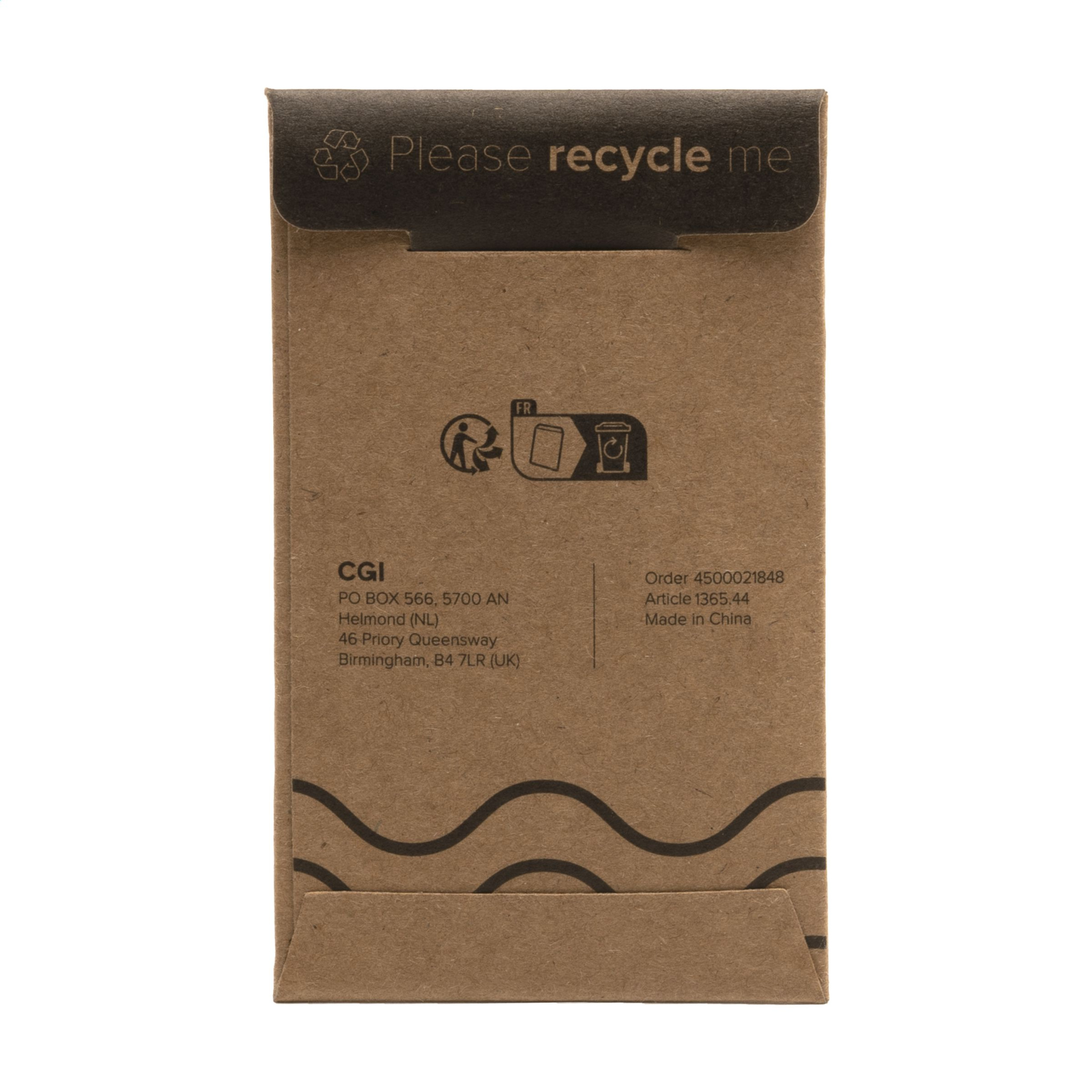 En rektangulär, polerad metallnyckelring med inlägg i bambu och en robust nyckelring. Varje artikel levereras i ett individuellt brunt kartongkuvert.