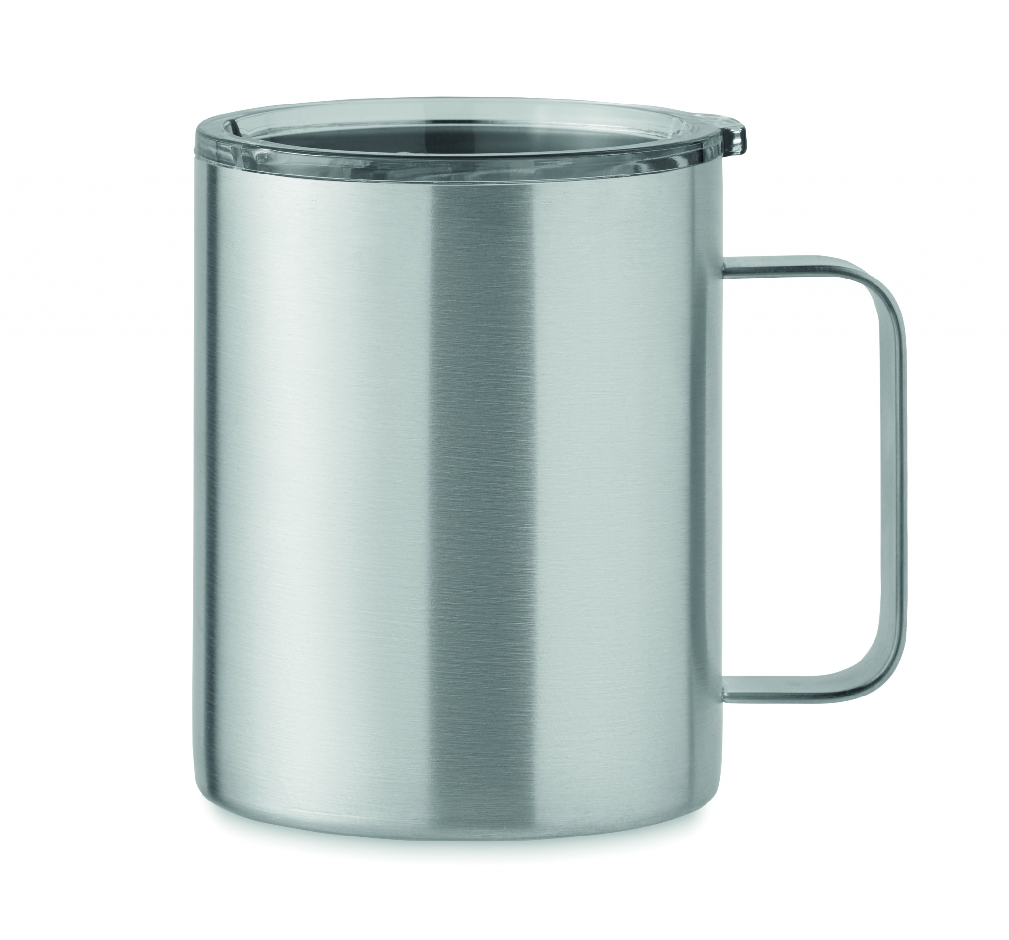 Mugg med dubbelvägg i återvunnet rostfritt stål (90 % återvunnet rostfritt och stål 10 % rostfritt stål) med glidande lock för siphål. Volym: 300 ml.